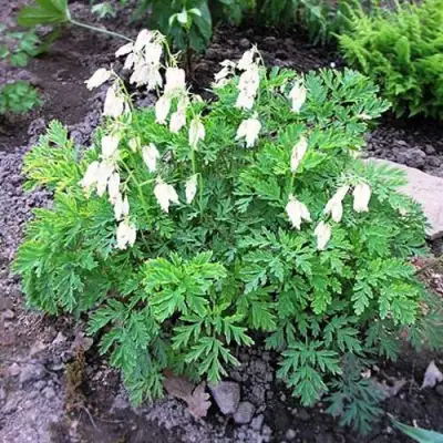 Дицентра красивая Аврора — гармоничный, компактный многолетник, который уверенно растёт в климате Беларуси и стабильно цветёт весь сезон. Этот цветок дицентра ценится за аккуратный куст, выразительную листву и чистый белый тон цветков, заметный даже в тени. Куст остаётся плотным, ровным, высотой около 30 см и шириной до 40–45 см. Тонкие упругие побеги не разваливаются, а матовые серебристо-зелёные листья подчёркивают нежность цветения.