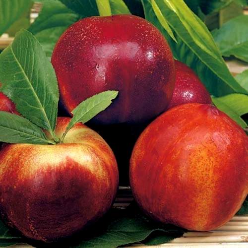 Плоды нектарина Старк Ред Голд выделяются своими размерами — они очень крупные, достигая веса до 200 граммов. Их карминово-красная окраска привлекает взгляд, а округлая форма вызывает желание попробовать. Мякоть плода желтого цвета ближе к косточке с красной пигментацией обладает слегка волокнистой и очень сочной текстурой. Не забудьте оценить выраженный аромат и высокую сладость — это делает нектарин настоящим лакомством для настоящих гурманов.