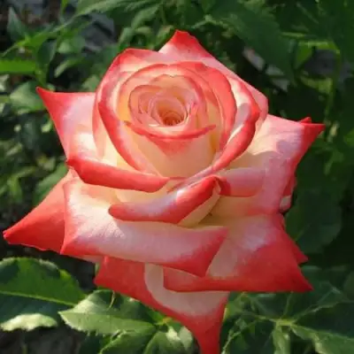 Одно из основных преимуществ этой розы – ее великолепный цветок. Бутон окрашен в белый цвет с бледно-малиновыми краями, что придает ему неповторимый шарм. Цветок сам по себе является двухцветным: у основания он белый, а по краям переходит в красный. Чашевидная форма цветка и крупный размер (диаметром 12-13 см) придают ему элегантность и изысканность.