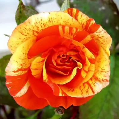 Главной особенностью розы "Апельсин и Лимон" является ярко-оранжево-желтая окраска цветка с полосатым узором. Окраска цветка яркая и насыщенная, что делает этот сорт очень привлекательным. Цветки полностью раскрывшиеся, плоские, крупные с диаметром до 9 см. Лепестки этой розы полумахровые. Цветки располагаются в соцветиях и на одном стебле может быть от 3 до 7 цветков. Аромат розы "Апельсин и Лимон" слегка душистый, но не слишком интенсивный.