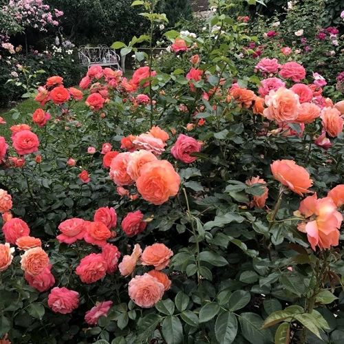 Цветение начинается в июне и идёт волнами до самых холодов. Цветки крупные — до 12 см в диаметре, густомахровые, с 80–90 лепестками. Форма — чашевидная, лепестки закручиваются внутрь, образуя изящную розетку. Цвет — насыщенный абрикосово-персиковый, с едва заметной красноватой подложкой у основания лепестков. Окраска не тускнеет даже на открытом солнце. В соцветиях — по 3–5 цветков, иногда больше. Роза ароматная: запах тёплый, пряный, с оттенками древесины и сухих трав.