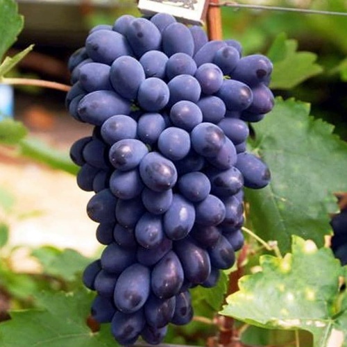 Кусты сильнорослые, быстро наращивают лозу и обеспечивают обильное плодоношение. Грозди крупные, весом 400–600 г, отдельные экземпляры достигают 1,5 кг. Ягоды овальные, темно-фиолетовые, массой 6–8 г, с плотной мясистой мякотью и тонкой съедаемой кожицей. Вкус гармоничный, с умеренной кислотностью и сахаронакоплением 18–19 %, что делает сорт идеальным для свежего потребления.